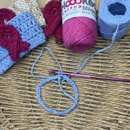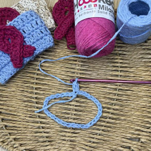 Faites une chaînette qui s’ajuste bien autour de votre tasse ou gobelet (pour la mienne : 33 mailles en l’air).